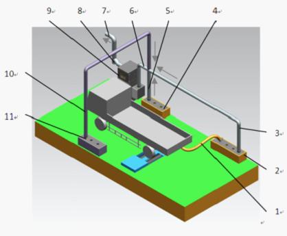 7、出气管 8、两分器 9、抽排处理主机 10、抽气支管3 11、防火沟3